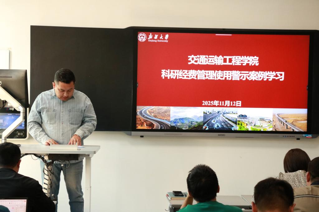 为规范科研经费管理,强化教师廉洁自律意识,筑牢科研经费使用安全防线,2025年11月12日下午,交通运输工程学院在A405教室组织召开全体教师会议,专题学习科研经费管理使用相关警示案例,会议由学院副书记依力亚尔·阿吉木主旨宣讲。