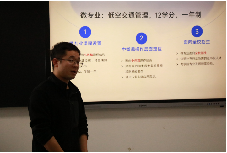 本次活动由学院何鹏老师和李兴源老师进行讲解。何鹏老师作题为“从地面向低空跨越”的本科新专业的申报建设工作汇报。何鹏老师从国家战略与区域需求、一微一专育人体系、具体挑战与解决路径、实验条件与科研聚焦四个方面系统阐述了新专业申报的必要性、系统性和未来前景。李兴源老师阐述了对高等教育教学的困惑。