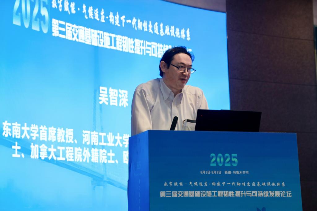 东南大学首席教授吴智深院士作《绿色高性能玄武岩纤维复合材料及其交通基础设施结构韧性增强技术》主旨报告。报告围绕钢筋混凝土结构耐久性和韧性需求,面向国家重大战略和工程结构挑战、结构低碳长寿、安全韧性与健康运维的需求,有效解决结构全寿命抗裂、寿命提升和可恢复性设计难题,为交通基础设施全寿命韧性提升与可持续发展提供关键技术支撑。