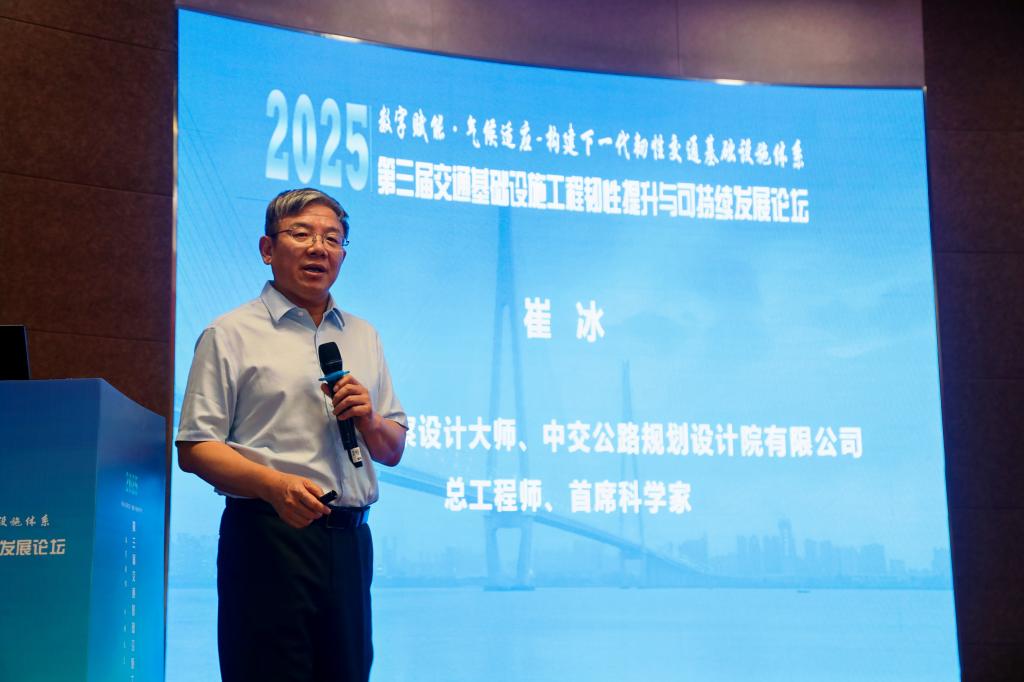 中交公路规划设计院有限公司总工程师、全国工程勘察设计大师崔冰作题为《桥梁结构高韧耐久、安全长寿技术发展与思考》主旨报告。结合多年的桥梁结构研究和工程实践,提出了面向安全、强韧、耐久、长寿的大跨度桥梁技术体系和理论方法,为桥梁工程全生命周期的性能保持与可持续发展提供了解决方案。