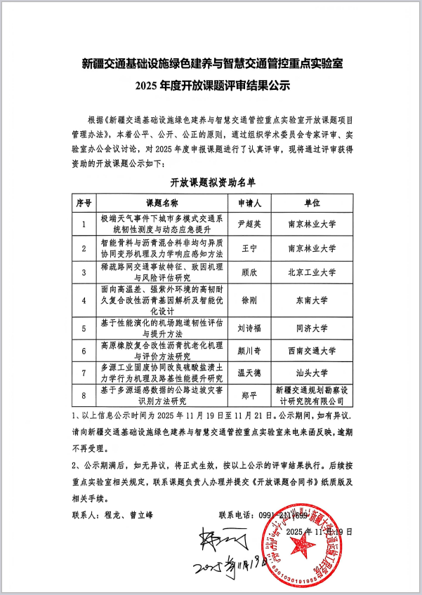 新疆交通基础设施绿色建养与智慧交通管控重点实验室2025年度开放课题评审结果公示